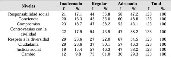 En la tabla 1 la responsabilidad social obtuvo un 17.1% inadecuado, con 35.8% regular y 47.2% adecuado. En el aspecto de conciencia presentó un 16.3% inadecuado, un 35% regular y 48.8% adecuado. En el compromiso un 18.7% inadecuado, un 38.2% regular, un 43.1% adecuado. En las controversias con la civilidad un 17.9% inadecuado, un 43.9% regular y un 38.2% adecuado. En el respeto a la diversidad se presentó un 23.6% inadecuado, un 22% regular y 54.5% adecuado. En la ciudadanía se obtuvo un 23.6% con niveles inadecuado, un 30.1% regular y 46.3% adecuado. En relación a la justicia social, presentó un 15.4% inadecuado, un 46.3% regular y un 38.2% de niveles adecuados. En el cambio un 9.8% inadecuado, un 61% regular y un 29.3% adecuado.