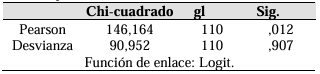 El ajuste de los valores presentó la Desvianza de x2 = 146,164 y una p>0,05; señalando que la data del modelo de regresión se encuentra ajustado y se interpreta como válido y aceptable.