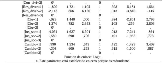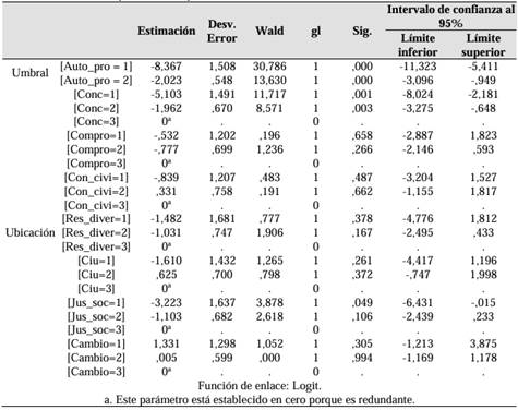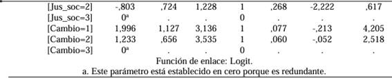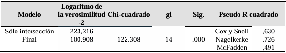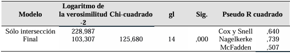 En el ajuste del modelo el p= 0.000 y siendo p<0,05; estos valores aseguran que el modelo de regresión es pertinente para el análisis. Además, Pseudo R2 para el estadístico de Nagelkerke reportó un ,739; que indicó que la responsabilidad social influye en un 73.9% en la asertividad y control emocional de las competencias empresariales de los estudiantes de administración