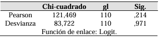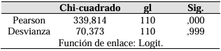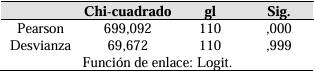 El ajuste de los valores presentó la Desvianza de x2 = 83,722 y una p>0,05; señalando que la data del modelo de regresión se encuentra ajustado y se interpreta como válido y aceptable.