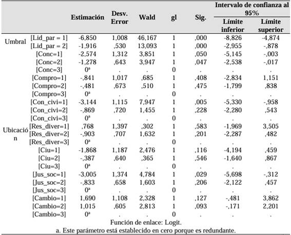 En las estimaciones del parámetro se obtuvo valores significativos de p< 0.05 para dimensiones de la variable independiente conciencia, controversia con la civilidad, justicia social y la variable dependiente liderazgo participativo de las competencias empresariales y el valor de Wald supero el valor de 4; por lo tanto, se rechazó la hipótesis nula y se consideró que La responsabilidad social influye significativamente en el liderazgo participativo de las competencias empresariales de los estudiantes de administración.
