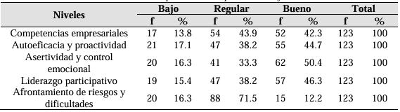 En la tabla 2, las competencias empresariales de los estudiantes, presentó un 13.8% con niveles bajo, un 43.9% regular y un 42.3% de nivel bueno. En la autoeficacia y proactividad un 17.1% con nivel bajo, un 38.2% regular y un 44.7% de nivel bueno. En la asertividad y control emocional, presentó un 16.3% de nivel bajo, un 33.3% regular y 50.4% de nivel bueno. En liderazgo participativo presentó un 15.4% con niveles bajo, un 38.2% regular y 46.3% de nivel bueno. En el afrontamiento de riesgos y dificultades presentó un 16.3% con niveles bajo, un 71.5% de nivel regular y un 12.2% con nivel bueno.