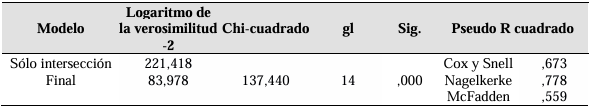 En el ajuste del modelo el p= 0.000 y siendo p<0,05; estos valores aseguran que el modelo de regresión es pertinente para el análisis. Además, Pseudo R2 para el estadístico de Nagelkerke reportó un ,778; que indicó que la responsabilidad social influye en un 77.8% en las competencias empresariales de los estudiantes de administración.