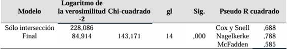 En el ajuste del modelo el p= 0.000 y siendo p<0,05; estos valores aseguran que el modelo de regresión es pertinente para el análisis. Además, Pseudo R2 para el estadístico de Nagelkerke reportó un ,788; que indicó que la responsabilidad social influye en un 78.8% en la autoeficacia y proactividad de las competencias empresariales de los estudiantes de administración.