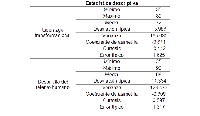En relación al desarrollo del talento humano, se reportaron valores mínimos y máximos similares al liderazgo transformacional (35 y 90) respectivamente, con una media de (68); La desviación típica (11.334) y la varianza (128.473), revelan una menor dispersión en las respuestas, lo que sugiere mayor homogeneidad en esta percepción; el coeficiente de asimetría (-0.309), apunta a una leve tendencia hacia la concentración de puntajes altos, mientras que la curtosis (0.597), refleja una ligera inclinación leptocúrtica, lo que sugiere una distribución algo más pronunciada en torno a la media. El error típico de 1.317 reafirma la precisión en la estimación del promedio.