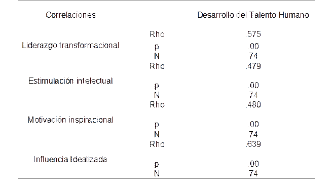 Referente a la influencia idealizada y el desarrollo talento humano en instituciones del sector salud en Perú, (Rho = 0.639, p = 0.00), presentó la correlación más alta entre las dimensiones analizadas, el resultado resalta que los líderes actúan como modelos de conducta y generan confianza entre sus colaboradores maximizando el desarrollo del talento humano, consolidándose como la dimensión más influyente del liderazgo transformacional.