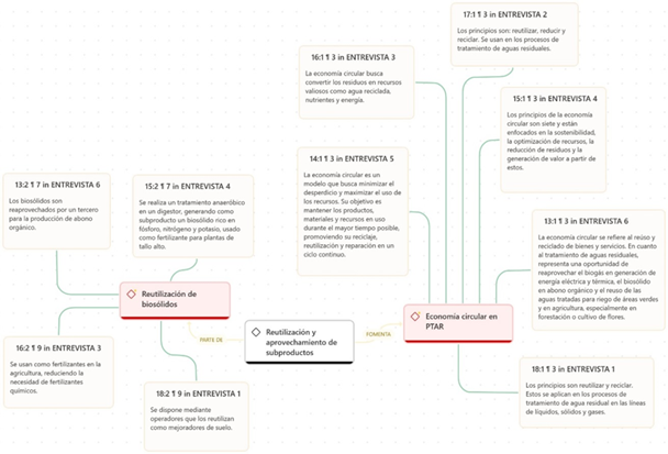 Subcategoría 1: Reutilización y aprovechamiento de subproductos, ella a su vez estuvo desagregada por: Conocimiento sobre economía circular y su impacto en el tratamiento de aguas, descripción de los métodos de recuperación de recursos en la PTAR, Evaluación de estrategias de reutilización de subproductos en la PTAR y Explicación de los procedimientos empleados en la PTAR para el tratamiento de aguas.