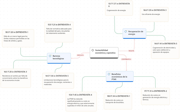 Subcategoría 2: Sostenibilidad económica y operativa, luego se disgregó en: Identificación de limitaciones y posibilidades de mejora en la PTAR, Análisis de la factibilidad financiera y ambiental de la economía circular en la PTAR, Identificación del impacto económico de la economía circular en la reducción de costos, Factores determinantes para la autosostenibilidad de la PTAR, Determinación de las ventajas económicas obtenidas mediante prácticas sostenibles y Evaluación del impacto financiero y plazo de retorno de inversión en sostenibilidad.
