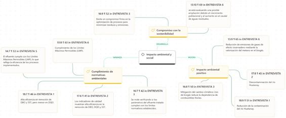 Subcategoría 3: Impacto ambiental y social, el cual se desagregó en: Percepción sobre la efectividad y sostenibilidad de las estrategias aplicadas, Análisis de la eficiencia del proceso de tratamiento de aguas residuales, Identificación de métricas clave para evaluar la eficiencia del tratamiento, Evaluación de beneficios ambientales derivados de la gestión de la PTAR, Compromiso y estrategias de largo plazo para la sostenibilidad ambiental e Identificación de aspectos técnicos y operativos con posibilidad de optimización.