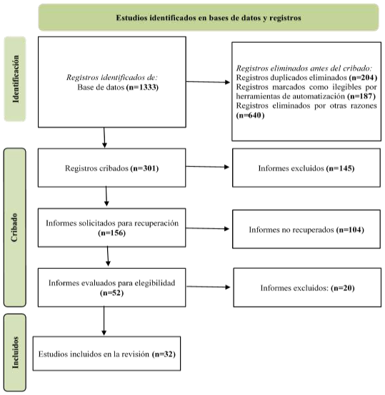 El flujograma PRISMA Figura 1, resume el proceso de selección de estudios para la revisión sistemática. Se identificaron 1.333 registros en bases de datos. Tras eliminar 204 duplicados, 187 registros ilegibles y 640 excluidos por otros motivos, se cribaron 301 registros por título/resumen. Se excluyeron 145 informes, solicitando 156 textos completos, de los cuales 104 no se recuperaron. En la fase de elegibilidad, se evaluaron 52 informes, excluyendo 20 por incumplir criterios. Por último, se incluyeron 32 estudios en la revisión. Este flujo refleja una selección rigurosa, con solo 2.5% de los registros originales cumpliendo todos los criterios de inclusión metodológicos y temáticos.