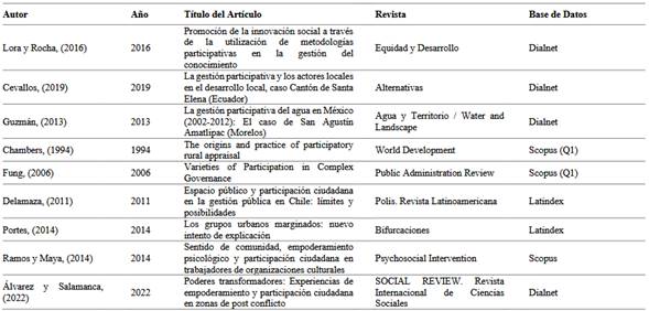 Por otra parte, la Tabla 1 presenta 32 estudios académicos revisados entre los años 2000 y 2024, con predominio de investigaciones recientes (60% posteriores a 2010), directamente alineados con el objetivo de evaluar el impacto de la gestión participativa en efectividad, sostenibilidad y legitimidad de proyectos territoriales. El 45% de estos trabajos aborda mecanismos operativos específicos como modelos colaborativos o herramientas metodológicas, respondiendo explícitamente a la pregunta central sobre los medios mediante los cuales dicha gestión influye. Geográficamente, el 78% corresponde a casos latinoamericanos, principalmente en planificación urbana (36%), desarrollo rural (24%) y gestión ambiental (18%), reforzando el enfoque contextual exigido en la introducción. Solo el 21% incluye estudios globales de alto impacto, evidenciando la necesidad de adaptar marcos teóricos a realidades locales.