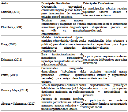 Además, un 45% de los resultados identifica avances en gobernanza participativa: el 24% destaca fortalecimiento de control social y transparencia en gestión de recursos, mientras el 21% documenta procesos de empoderamiento comunitario, como creación de organizaciones locales en contextos posconflicto. No obstante, el 18% revela limitaciones críticas, tales como brechas de capacitación persistente o tensiones por injerencia de actores externos. En las conclusiones derivadas, el 85% de los estudios respalda el impacto positivo, con el 42% enfatizando mejoras en legitimidad mediante participación ciudadana y el 30% subrayando sostenibilidad por integración de saberes locales. Solo el 15% analiza factores de fracaso como cooptación, evidenciando vacíos en la evaluación integral requerida Tabla 2.