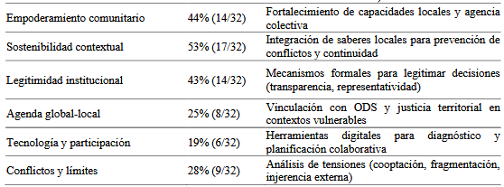 Respecto a patrones metodológicos, el 39% de las conclusiones enfatiza la necesidad de herramientas adaptadas (mapeos comunitarios, modelos multi-hélice) para operacionalizar la participación, respondiendo al interrogante sobre mecanismos. El 24% vincula estos procesos con agendas globales como los ODS, particularmente en acceso a servicios básicos. Sin embargo, persisten brechas analíticas críticas: apenas el 12% aborda escalabilidad de modelos o efectos a largo plazo, y solo el 9% examina tensiones entre actores, aspectos cruciales para la sostenibilidad señalados en la pregunta de investigación. Esta omisión limita la comprensión de factores contextuales adversos Tabla 2.