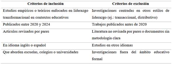 Con el fin de asegurar la calidad y pertinencia de los estudios seleccionados, se establecieron criterios de inclusión y exclusión claros, Tabla 1.