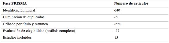 Estos criterios permitieron identificar únicamente aquellas investigaciones que aportaban evidencia sólida y actualizada para el análisis objetivo del tema. El proceso de selección siguió las cuatro etapas establecidas por el protocolo PRISMA, Tabla 2: identificación, cribado, elegibilidad y síntesis. Inicialmente, se recuperaron 640 registros de las bases de datos mencionadas. Tras eliminar duplicados y aplicar los criterios de inclusión/exclusión, se obtuvo un total de 13 estudios para el análisis final.