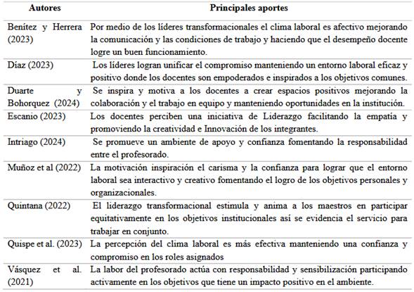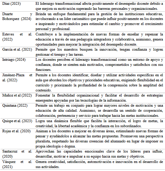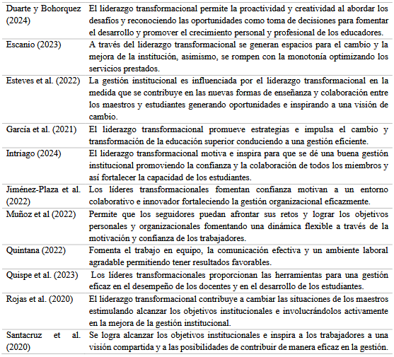 Conforme a lo descrito, se tiene que los líderes transformacionales contribuyen a la creación de un clima laboral donde los docentes se muestran comprometidos y sientes que son valorados. De esta manera repercute en la satisfacción laboral y al ambiente armonioso para el logro de los resultados. Otro aspecto sobresaliente del impacto del liderazgo transformacional se da en la gestión institucional, la cual es clave para el crecimiento y la sostenibilidad tanto de organizaciones educativas como empresariales. Más allá de los procesos técnicos, su implementación impacta directamente en la calidad del servicio, en la eficacia de los recursos y, sobre todo, en las personas que forman parte de estas instituciones. Respecto a esta influencia, en la Tabla 3 se describen los aportes analizados.