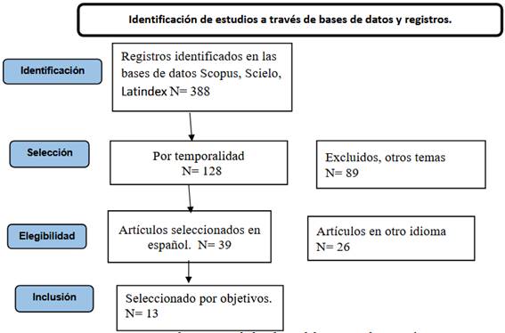 Para mitigar sesgos potenciales en la selección de estudios, se aplicó un proceso de cribado en doble etapa: primero se revisaron títulos y resúmenes para descartar registros por temporalidad o temática (89 artículos excluidos), luego se evaluó la elegibilidad por idioma y acceso (26 registros descartados). Finalmente, se realizó la lectura completa de los textos restantes, seleccionando 13 artículos que cumplían con los objetivos del estudio y los estándares metodológicos definidos. Este proceso se visualiza en el flujograma de la Figura 1, que ilustra las fases de identificación, cribado, elegibilidad e inclusión, conforme al protocolo PRISMA.