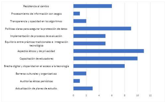 Asimismo, Contreras y Olaya (2025) aportan una perspectiva empírica sobre la percepción estudiantil, en la que indican que, aunque la IA mejora el rendimiento académico, existen resistencias vinculadas a brechas formativas y técnicas. Esta dualidad se refleja también en los hallazgos del presente estudio, en el que se documenta la falta de capacitación docente como un obstáculo recurrente. En contraste a ello, autores como Gallent et al. (2023) y Sánchez (2023) resaltan la implementación de marcos éticos internacionales como referentes para orientar la implementación responsable, lo que complementa la necesidad de políticas claras y contextualizadas, identificadas en esta investigación.