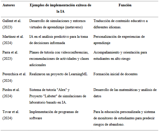 La revisión de literatura y los hallazgos sistematizados en la tabla 2 evidencian múltiples ejemplos de implementación exitosa de la inteligencia artificial (IA) en instituciones universitarias, reflejando su impacto positivo en diversos ámbitos de la gestión educativa, la docencia y la investigación y, demostrando que la implementación de la inteligencia artificial en el ámbito universitario no solo es viable, sino también transformadora, al potenciar la eficiencia institucional, la calidad educativa y la equidad en el acceso al conocimiento.
