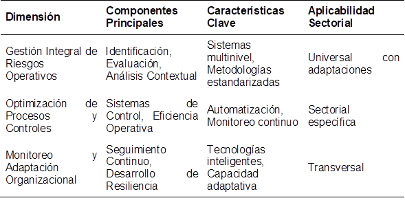 Los hallazgos de esta revisión conceptual evidencian la existencia de un marco integrado de gestión de riesgos operativos que trasciende sectores específicos mientras mantiene capacidad de adaptación contextual. La convergencia conceptual identificada en las tres dimensiones fundamentales sugiere la existencia de principios universales que pueden ser aplicados transversalmente, aunque requieren adaptaciones específicas según características organizacionales, sectoriales y ambientales particulares.